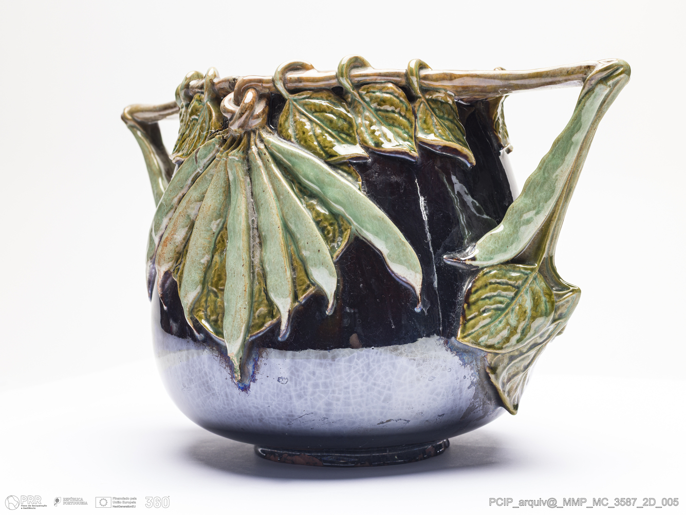 Matéria/Técnica: Barro moldado e modelado. Vidrado polícromo: negro metalizado, tons de verde de cobre, castanho de manganês e amarelo ferro; Cronologia: 1910; Autoria: António Augusto da Costa Mota / Fábrica de Faianças das Caldas da Rainha; Dimensões (cm): Altura: 42; Largura: 19; Comprimento: 31.