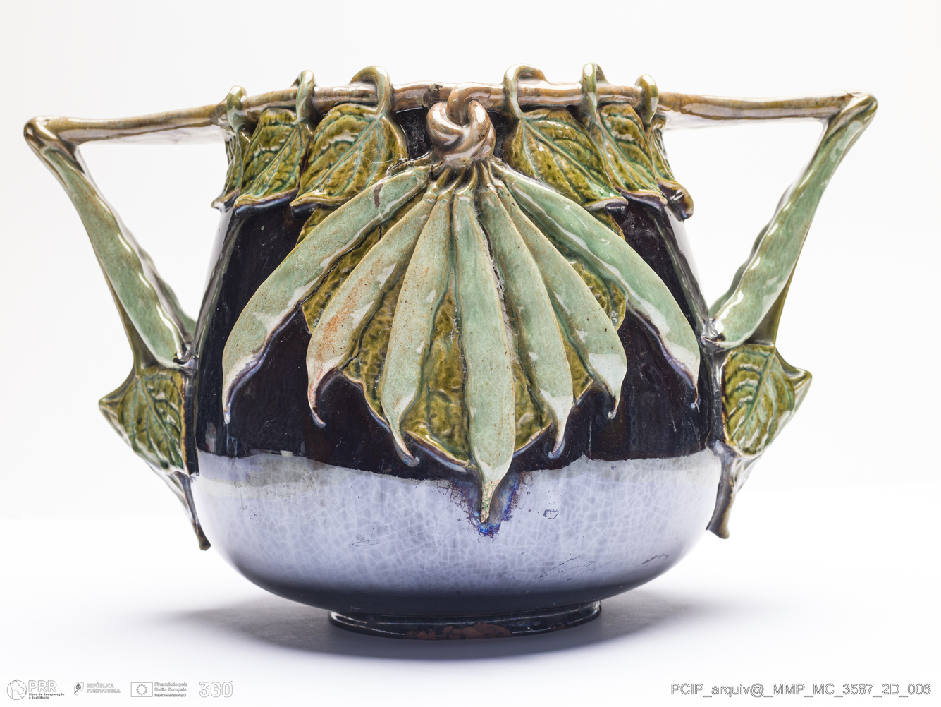 Matéria/Técnica: Barro moldado e modelado. Vidrado polícromo: negro metalizado, tons de verde de cobre, castanho de manganês e amarelo ferro; Cronologia: 1910; Autoria: António Augusto da Costa Mota / Fábrica de Faianças das Caldas da Rainha; Dimensões (cm): Altura: 42; Largura: 19; Comprimento: 31.