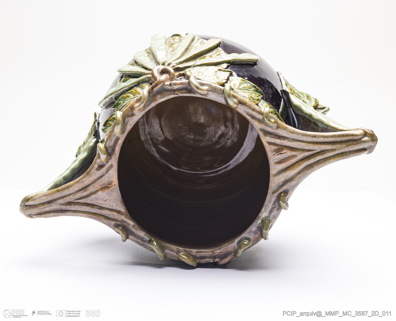 Matéria/Técnica: Barro moldado e modelado. Vidrado polícromo: negro metalizado, tons de verde de cobre, castanho de manganês e amarelo ferro; Cronologia: 1910; Autoria: António Augusto da Costa Mota / Fábrica de Faianças das Caldas da Rainha; Dimensões (cm): Altura: 42; Largura: 19; Comprimento: 31.
