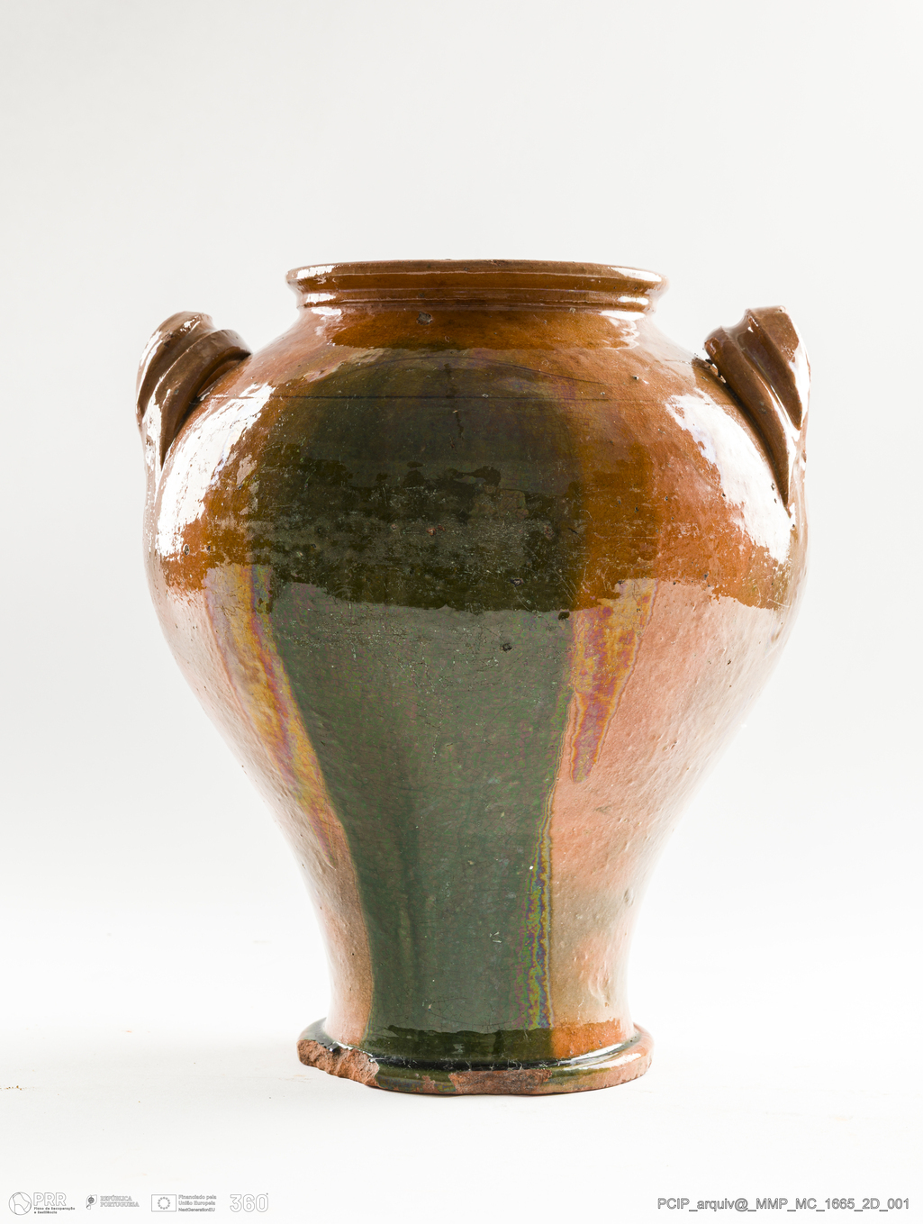 Matéria/Técnica: Barro vermelho rodado. Vidrado polícromo amarelo mel e verde de cobre; Cronologia: século XIX; Autoria: Desconhecido. Caldas da Rainha; Dimensões (cm): Altura: 31; Largura: 24.