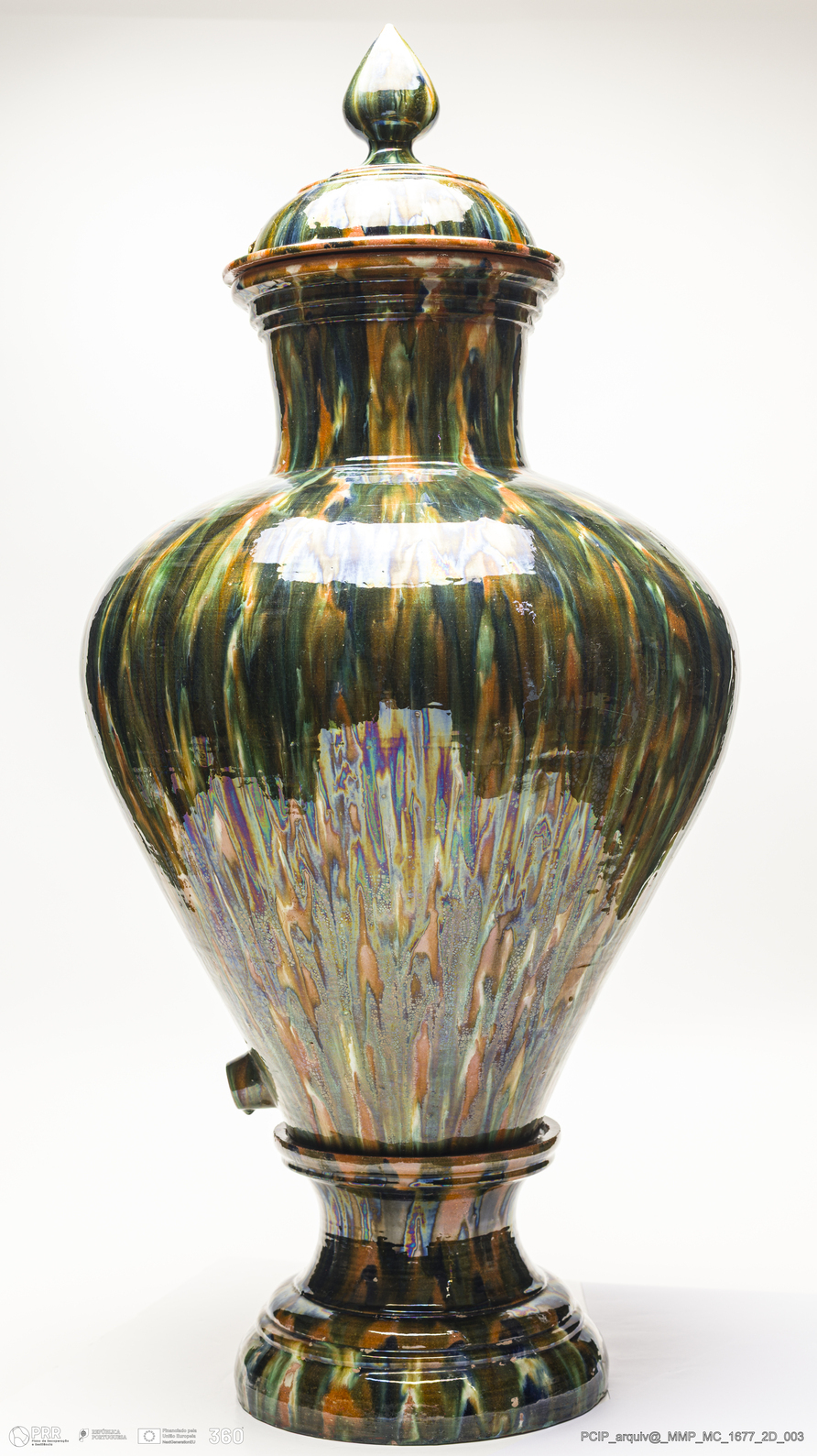 Matéria/Técnica: Barro vermelho rodado. Vidrado polícromo com escorridos; Cronologia: 1945; Autoria: João Jesuíno Marques dos Reis / Olaria de João Reis, Caldas da Rainha, Portugal; Dimensões (cm): Altura: 92,5; Diâmetro: 43.