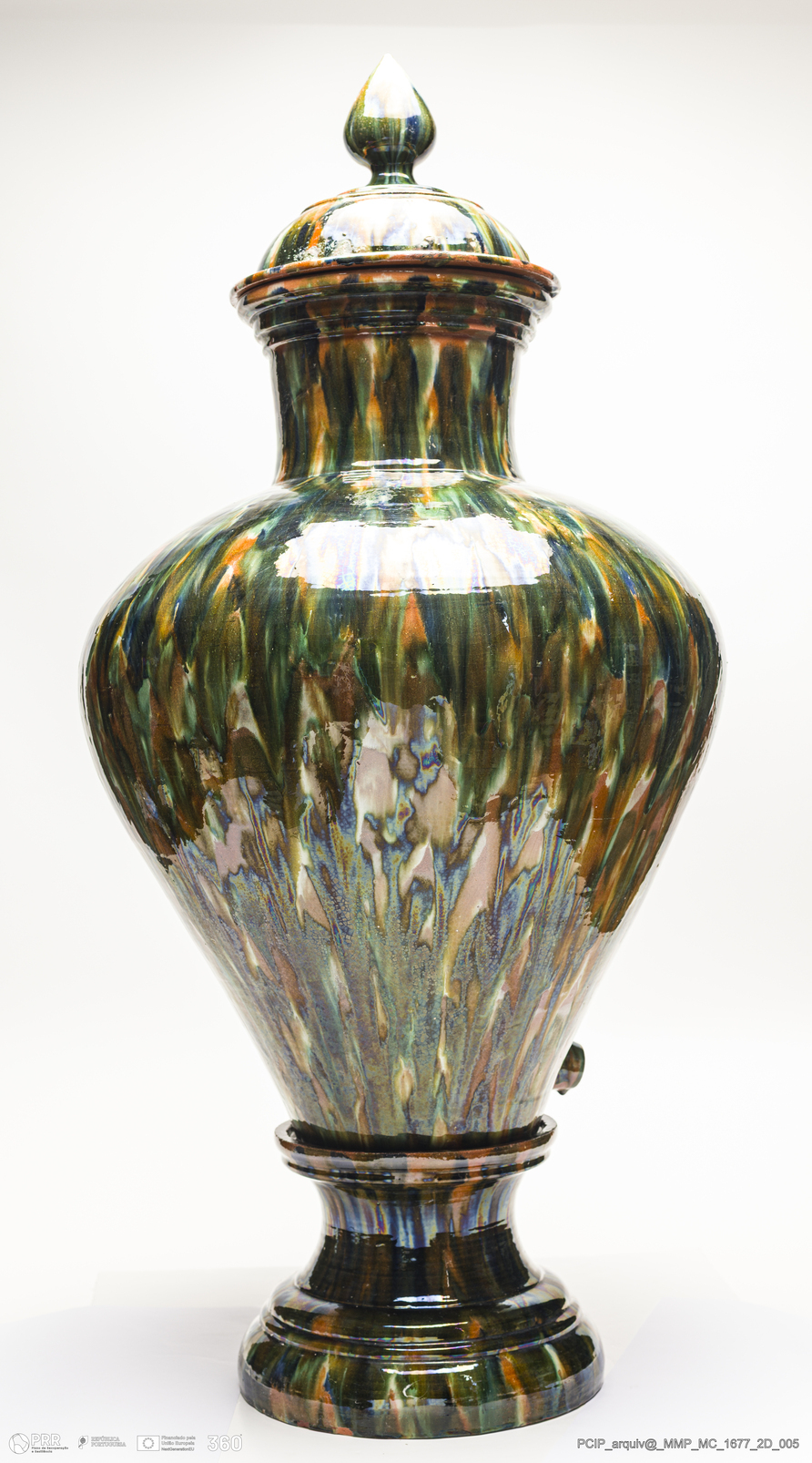 Matéria/Técnica: Barro vermelho rodado. Vidrado polícromo com escorridos; Cronologia: 1945; Autoria: João Jesuíno Marques dos Reis / Olaria de João Reis, Caldas da Rainha, Portugal; Dimensões (cm): Altura: 92,5; Diâmetro: 43.