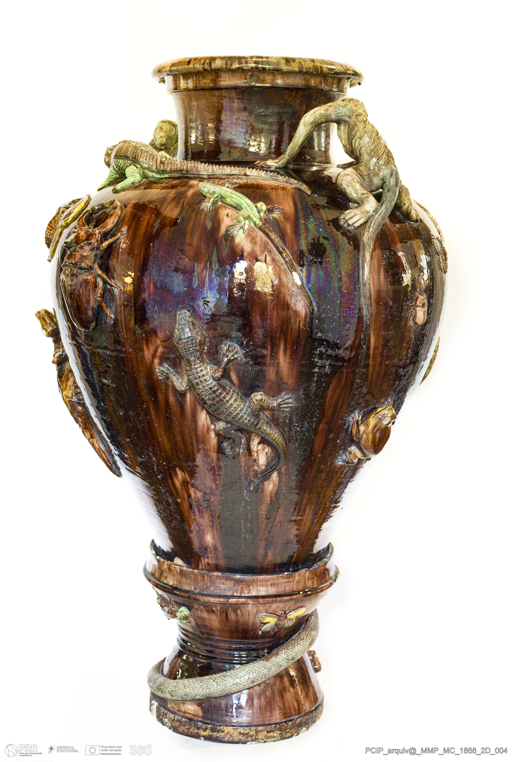 Matéria/Técnica: Barro rodado e modelado. Vidrado polícromo: castanho com escorridos, cinzento azul, verde e amarelo; Cronologia: 1853-1905; Autoria: Desconhecido / Atribuído à Fábrica de Manuel Cipriano Gomes Mafra; Dimensões (cm): Altura: 91; Largura: 49; Comprimento: 54.