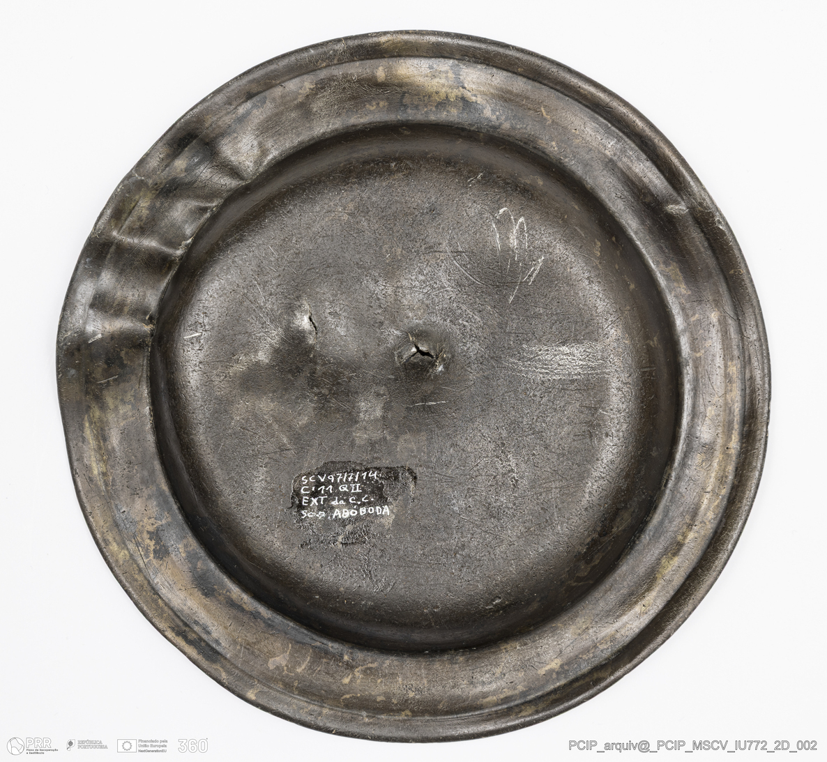 Matéria/Técnica: Metal; Cronologia: Século XVII; Autoria: Desconhecida; Dimensões: Altura: 13mm; Diâmetro: 162mm; Diâmetro base: 105mm.