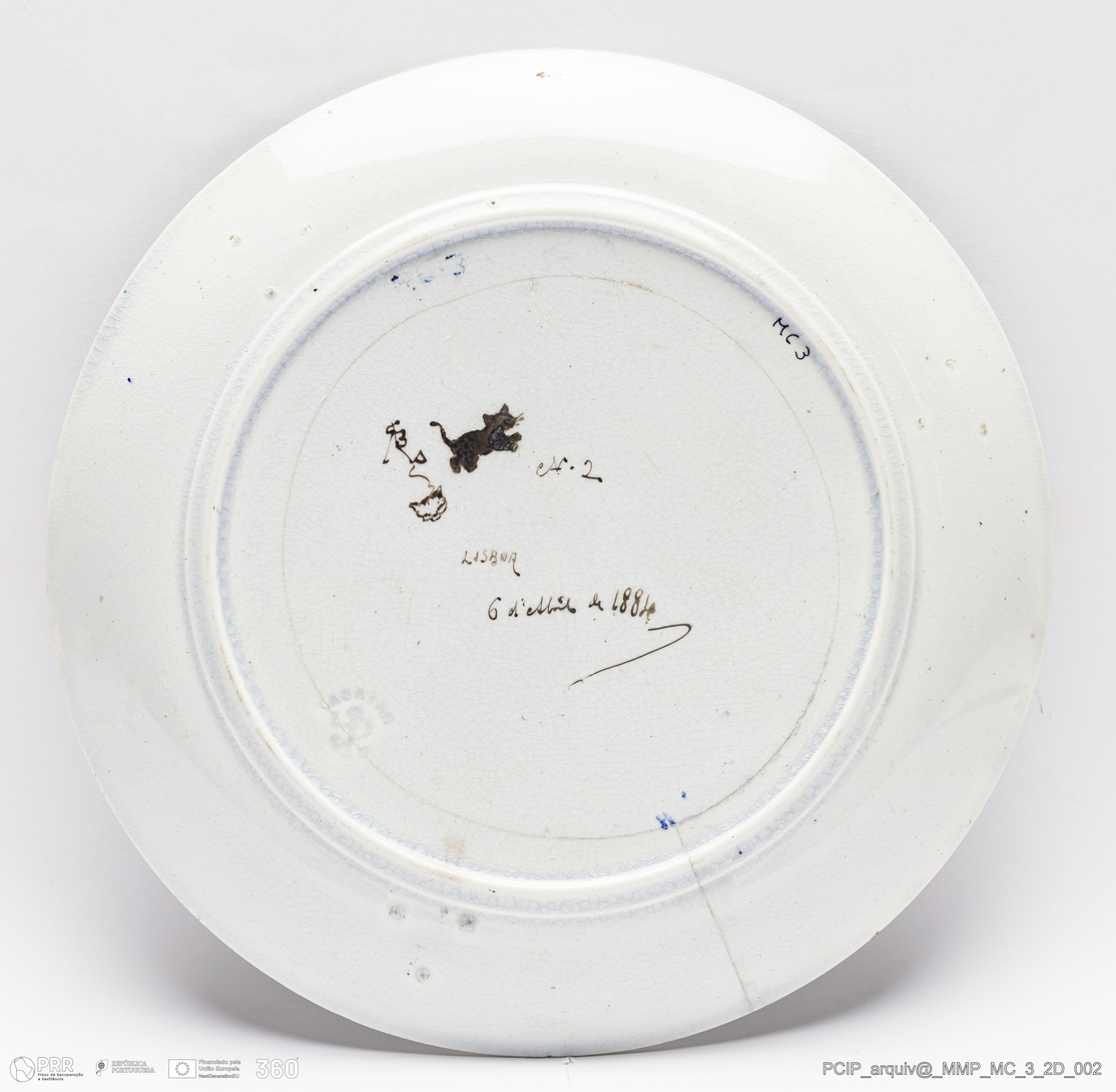 Matéria/Técnica: Pó de pedra rodado, Decoração polícroma, pintura a frio: preto, castanho escuro e mel, verde, vermelho, amarelo e camurça; Cronologia: 1884; Autoria: Rafael Bordalo Pinheiro / Fábrica de Louça de Sacavém, Portugal; Dimensões (cm): Altura: 1,5; Diâmetro: 22.