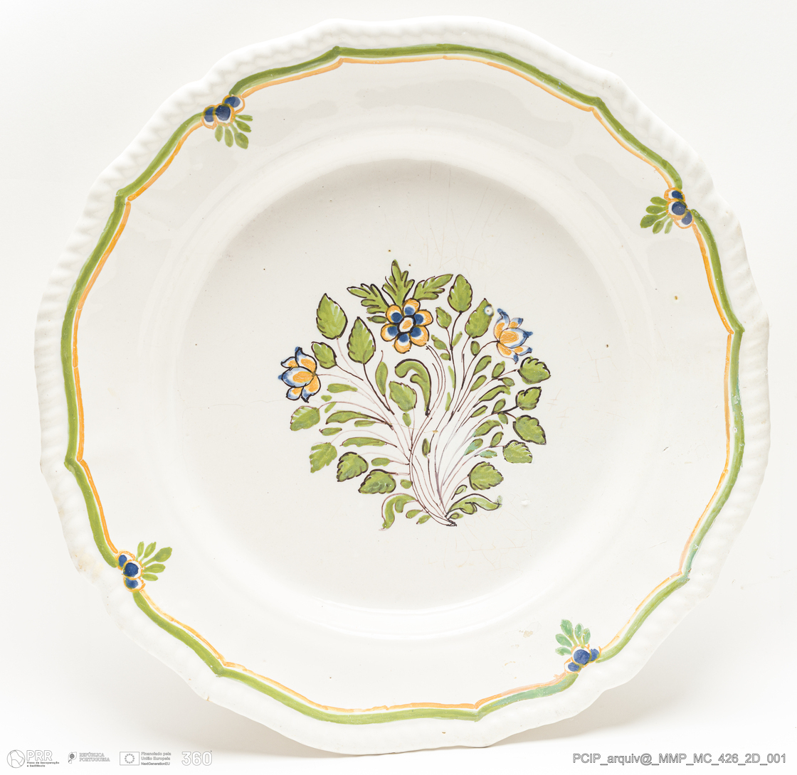 Matéria/Técnica: Faiança rodada e modelada. Vidrado polícromo: verde, azul, amarelo e branco; Cronologia: século XIX; Autoria: Desconhecido / Fábrica de Viana, Viana do Castelo, Portugal; Dimensões (cm): Altura: 3,5; Diâmetro: 35.