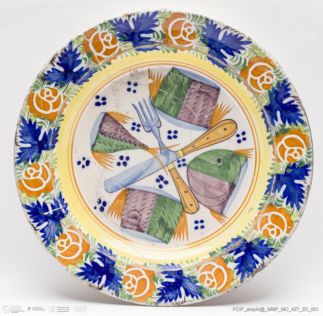 Matéria/Técnica: Barro vermelho rodado. Vidrado polícromo: amarelo, azul, laranja, verde e branco anilado; Cronologia: século XIX; Autoria: Desconhecido; Dimensões (cm): Altura: 4,5; Diâmetro: 31.