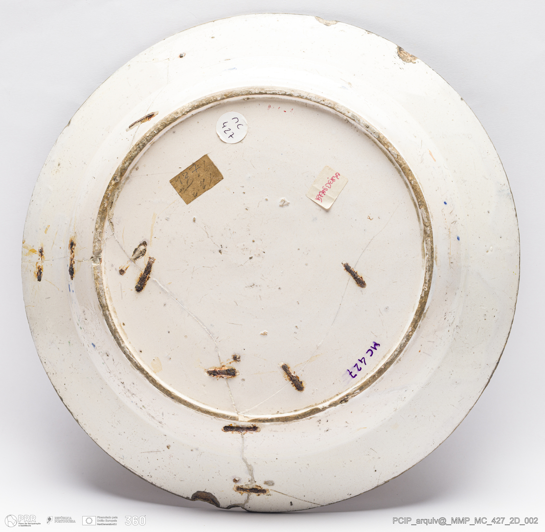 Matéria/Técnica: Barro vermelho rodado. Vidrado polícromo: amarelo, azul, laranja, verde e branco anilado; Cronologia: século XIX; Autoria: Desconhecido; Dimensões (cm): Altura: 4,5; Diâmetro: 31.