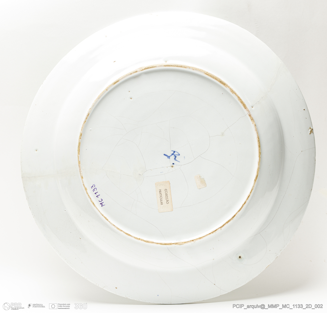 Matéria/Técnica: Faiança rodada e moldada. Pintado a azul sobre fundo branco; Cronologia: 1775-1822; Autoria: Desconhecido / Fábrica de Miragaia, Porto (Gaia), Portugal; Dimensões (cm): Altura: 4; Diâmetro: 39.