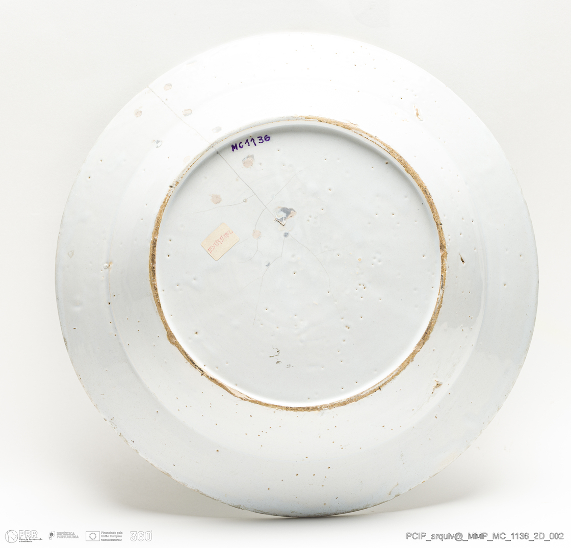 Matéria/Técnica: Faiança rodada. Pintura com óxido de cobalto; Cronologia: século XIX; Autoria: Desconhecido / Viana do Castelo, Portugal; Dimensões (cm): Diâmetro: 34,5.