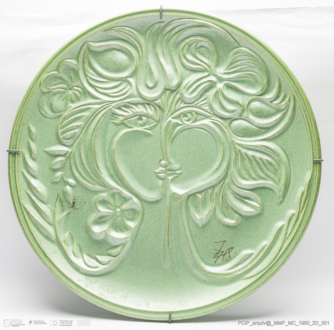 Matéria/Técnica: Barro rodado e moldado. Vidrado verde; Cronologia: 1960-1970; Autoria: Luis Ferreira da Silva / Atr. Fábrica Secla, Caldas da Rainha, Portugal; Dimensões (cm): Diâmetro: 36,7.