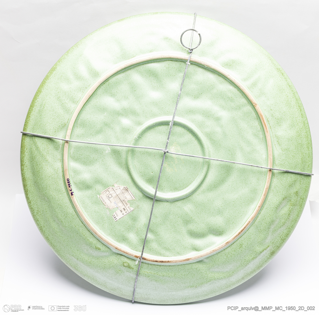 Matéria/Técnica: Barro rodado e moldado. Vidrado verde; Cronologia: 1960-1970; Autoria: Luis Ferreira da Silva / Atr. Fábrica Secla, Caldas da Rainha, Portugal; Dimensões (cm): Diâmetro: 36,7.