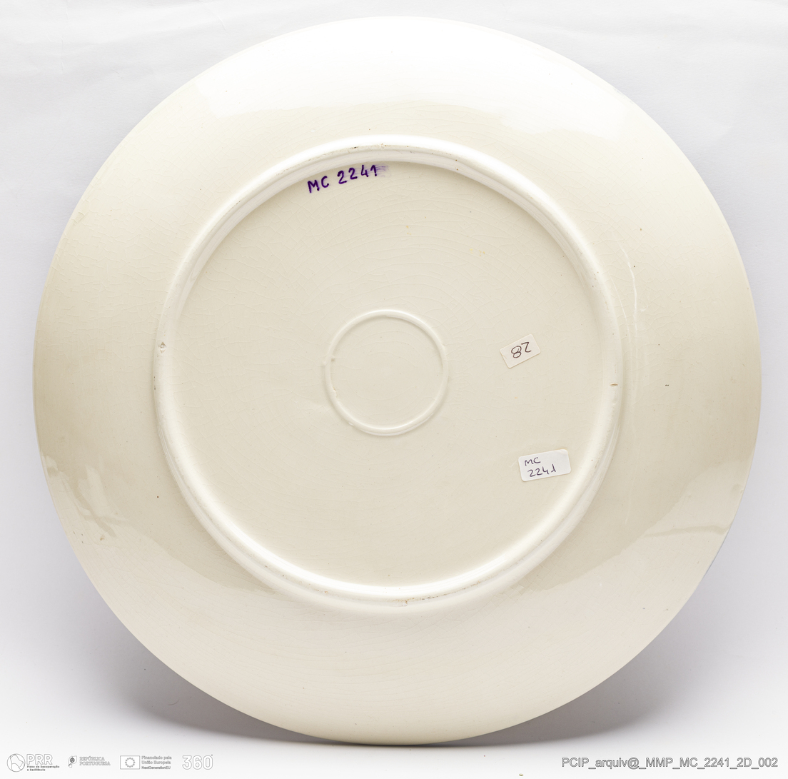 Matéria/Técnica: Pasta branca executada ao jaule, rodada e moldada. Tintas de água sobre vidrado transparente; Cronologia: 1947-1950; Autoria: Desconhecido / Fábrica Secla, Caldas da Rainha, Portugal; Dimensões (cm): Diâmetro: 34.
