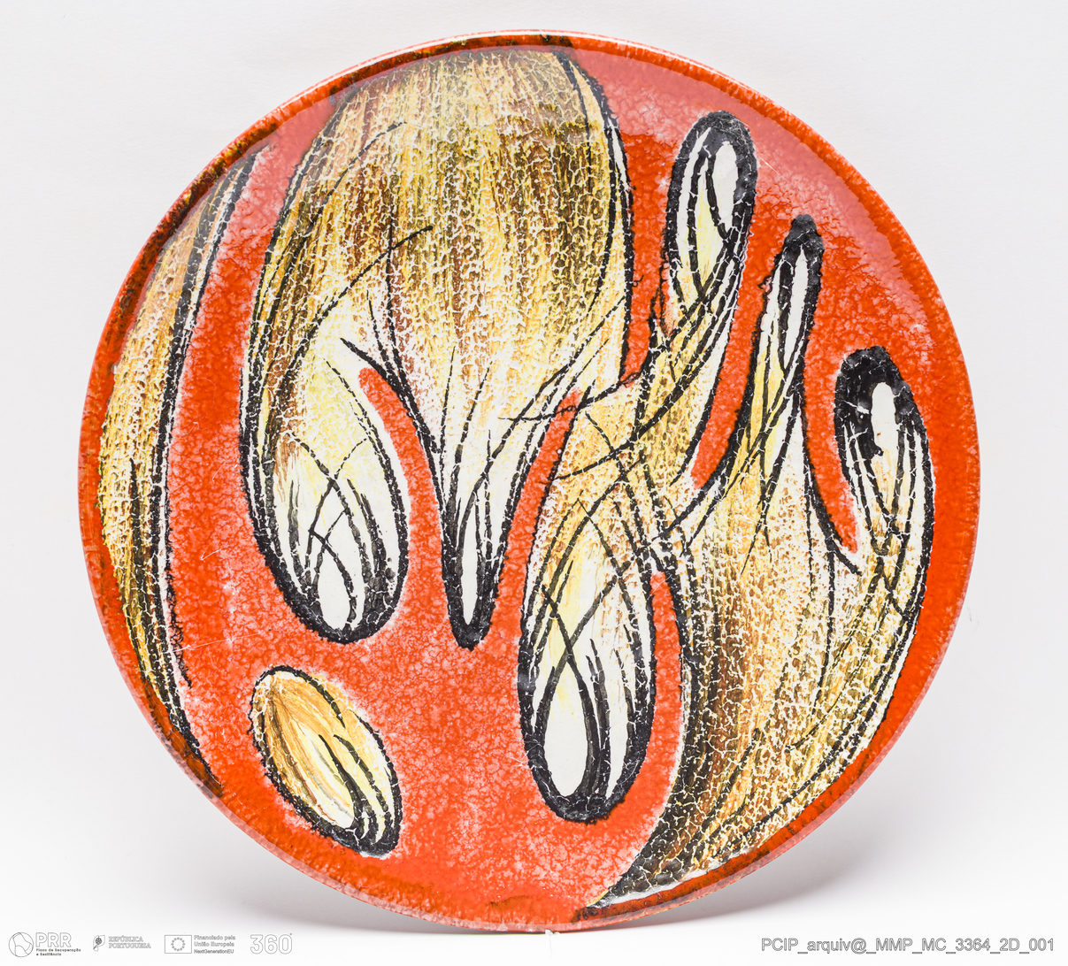Matéria/Técnica: Faiança moldada, vidrada com tintas de alto fogo. Vidrado polícromo: preto, castanho escuro e mel, laranja, amarelo e branco; Cronologia: Século XX; Autoria: V. Mazzotti / Albisola. Itália; Dimensões (cm): Desconhecidas.