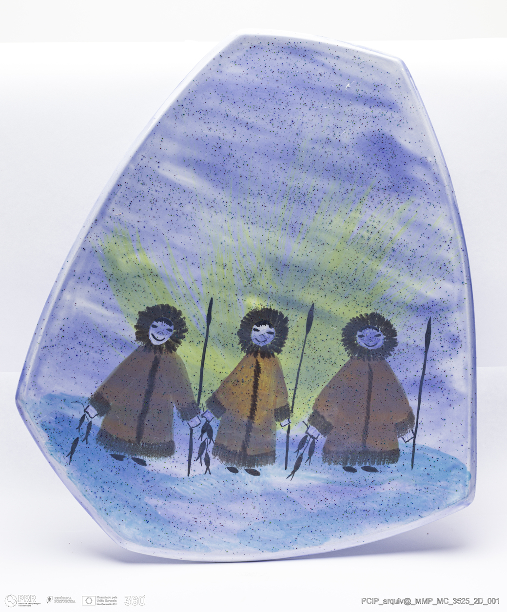 Matéria/Técnica: Barro branco moldado. Vidrado polícromo: preto, azul, castanho e amarelo; Cronologia: século XX; Autoria: Desconhecido / Rim, Canadá; Dimensões (cm): alçt 5; Largura: 30; Comprimento: 34.