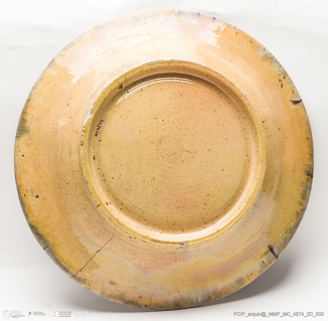 Matéria/Técnica: Barro moldado e modelado. Vidrado polícromo: castanho escuro e claro,; verde sobre escorridos em tons de castanho; Cronologia: 1903; Autoria: Ângelo Marcelino Garcia / Caldas da Rainha; Dimensões (cm): Altura: 6,5; Diâmetro: 40.
