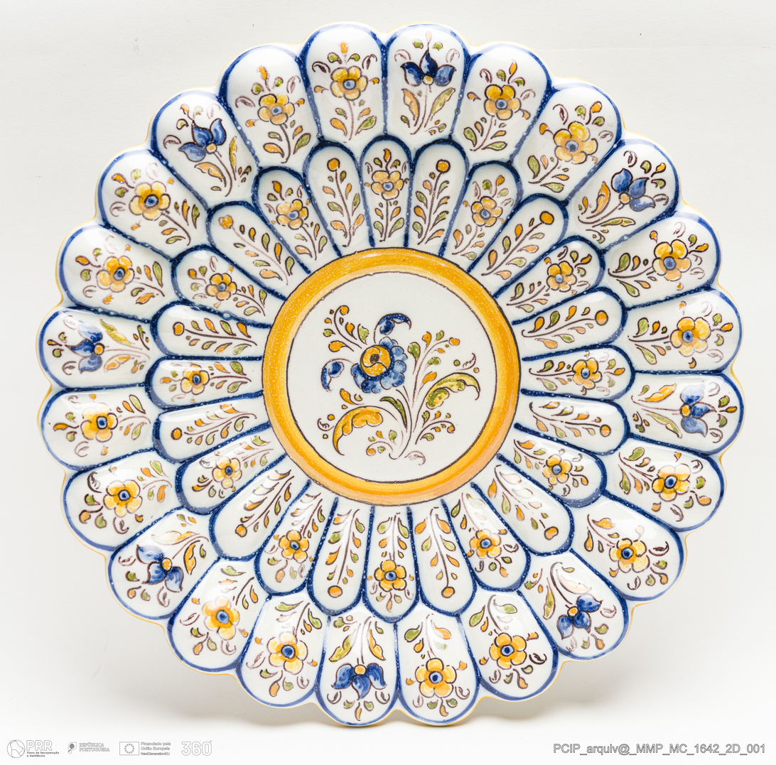 Matéria/Técnica: Faiança moldada. Vidrado polícromo sobre fundo estanifero; Cronologia: 1957; Autoria: Desconhecido. Talavera de la Reina. Espanha; Dimensões (cm): Diâmetro: 31,5.