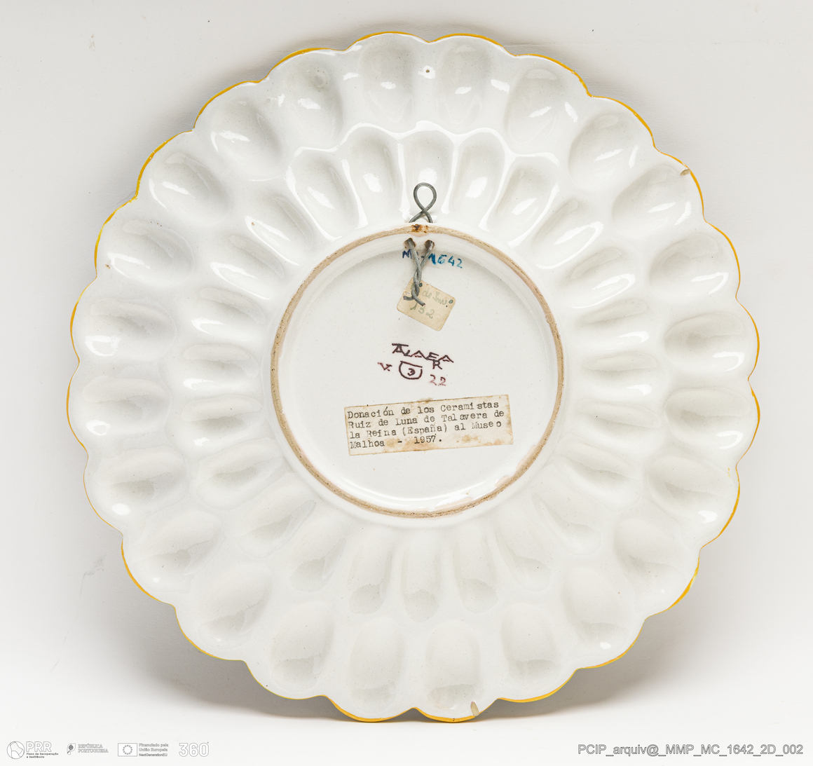 Matéria/Técnica: Faiança moldada. Vidrado polícromo sobre fundo estanifero; Cronologia: 1957; Autoria: Desconhecido. Talavera de la Reina. Espanha; Dimensões (cm): Diâmetro: 31,5.