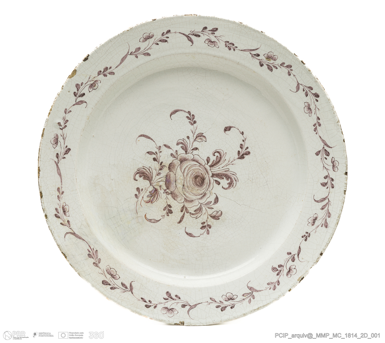 Matéria/Técnica: Faiança, rodada e moldada. Vidrado branco e manganês; Cronologia: século XIX; Autoria: Desconhecido. Fábrica de Louças de Santo António do Vale da Piedade. Vila Nova de Gaia. Porto; Dimensões (cm): Diâmetro: 37.