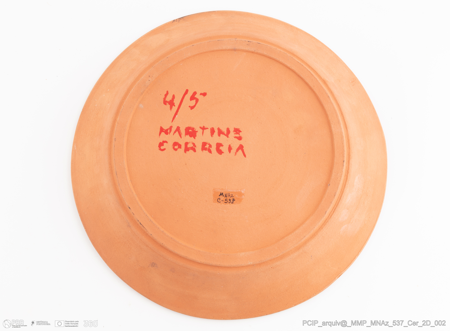 Matéria/ Técnica: Barro; Cronologia: Século XX; Autoria: Correia, Martins (Portugal); Dimensões (cm): Altura: 5,5 cm; Diâmetro: 35 cm.