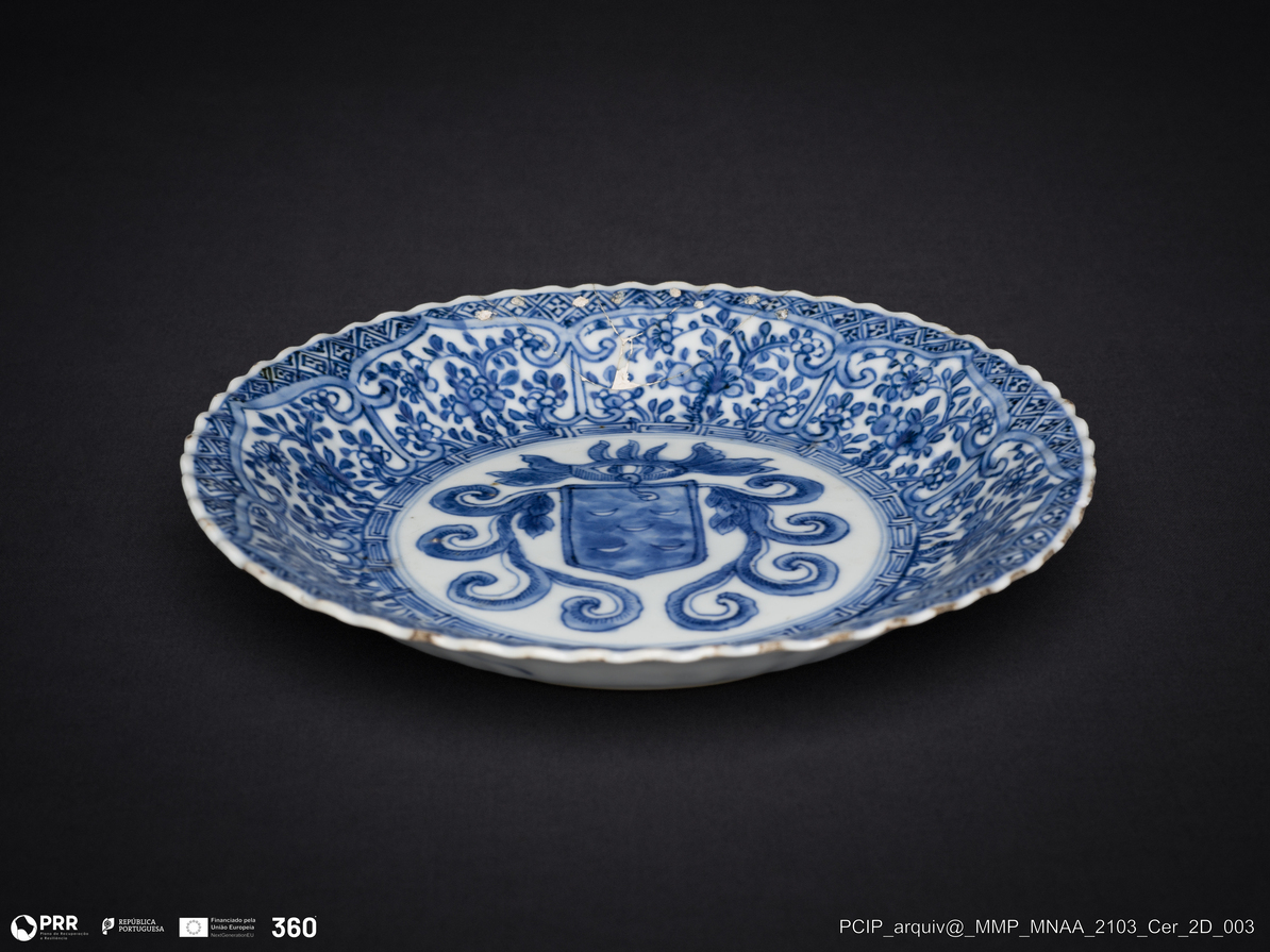 Matéria/Técnica: Moldada e colorida a azul de cobalto; Cronologia: 1690-1700; Autoria: Desconhecida; Dimensões (cm): Altura: 3,4 x Diâmetro: 21,5.