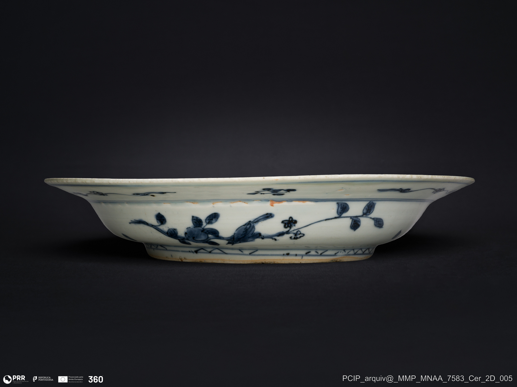 Matéria/Técnica: Porcelana pintada a azul.; Cronologia: 1501-1600; Autoria: Desconhecida; Dimensões (cm): Altura: 6 x Diâmetro: 30,5.