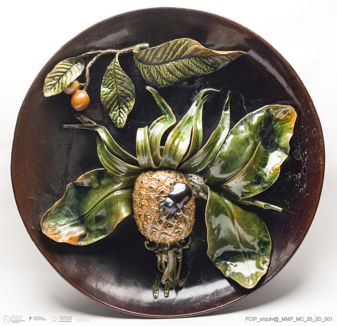 Matéria/Técnica: Barro vermelho moldado e modelado. Vidrado polícromo: preto, castanho escuro e mel, vermelho, verde e camurça; Cronologia: 1899; Autoria: Rafael Bordalo Pinheiro / Fábrica de Faianças das Caldas da Rainha, Portugal; Dimensões (cm): Altura: 20; Diâmetro: 60.