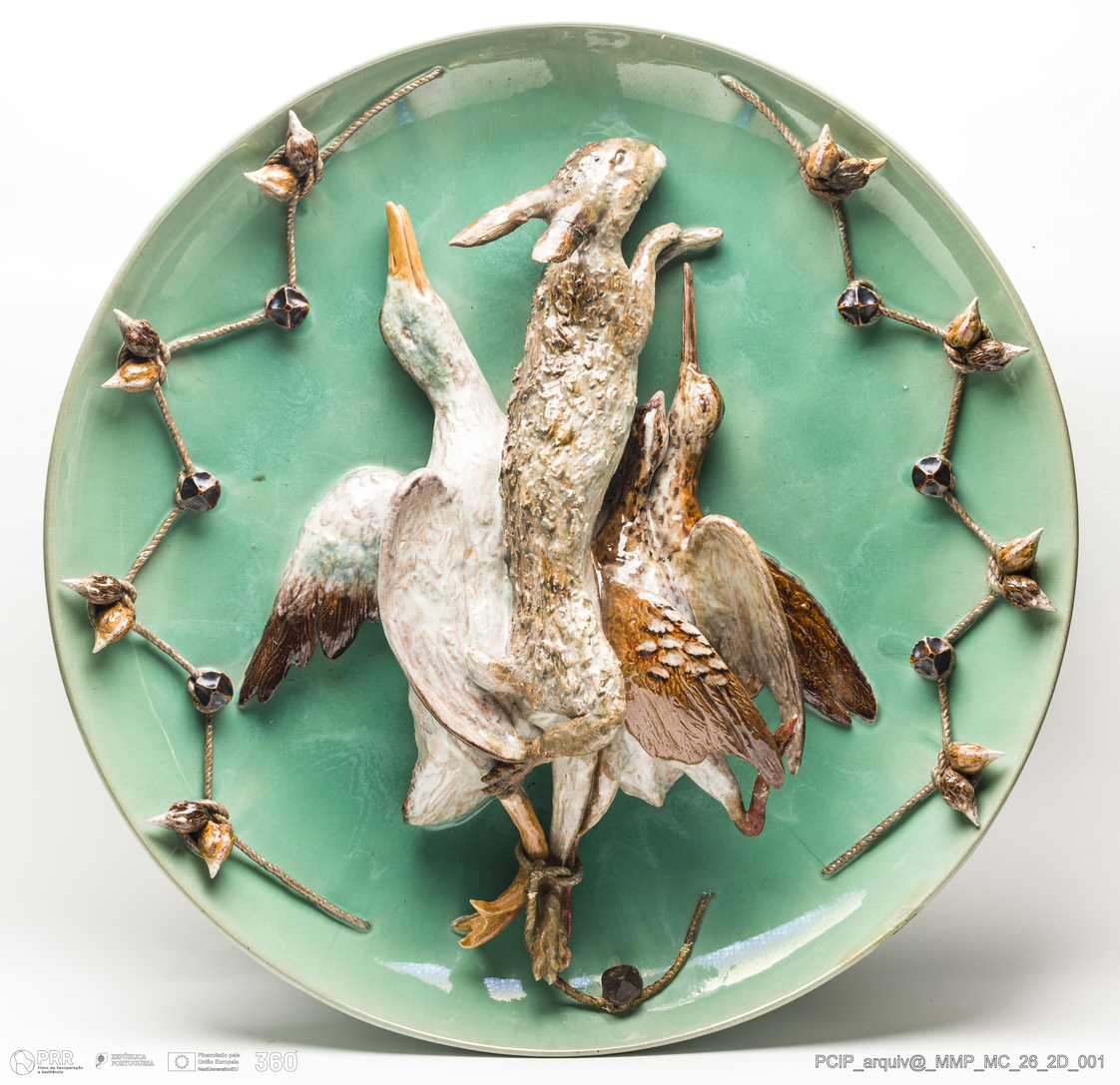 Matéria/Técnica: Barro vermelho rodado e moldado. Vidrado polícromo: castanho escuro e mel, verde, azul, cinzento e laranja; Cronologia: 1888; Autoria: Rafael Bordalo Pinheiro / Fábrica de Faianças das Caldas da Rainha, Portugal; Dimensões (cm): Altura: 16; Diâmetro: 61.