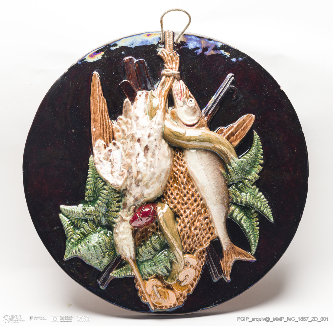 Matéria/Técnica: Barro moldado e modelado. Vidrado polícromo: azul cobalto, com efeitos irizados; castanho escuro, verde, vermelho, camurça e castanho claro; Cronologia: 1908-1916; Autoria: António Augusto da Costa Motta / Fábrica de Faianças das Caldas da Rainha, Portugal; Dimensões (cm): Altura: 8,5; Diâmetro: 41,5.