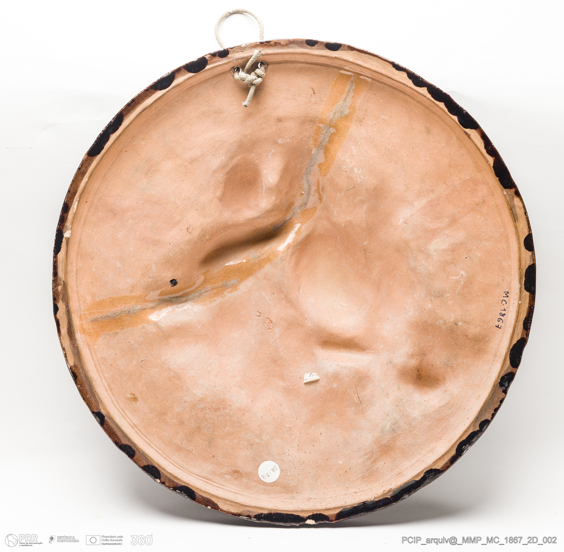 Matéria/Técnica: Barro moldado e modelado. Vidrado polícromo: azul cobalto, com efeitos irizados; castanho escuro, verde, vermelho, camurça e castanho claro; Cronologia: 1908-1916; Autoria: António Augusto da Costa Motta / Fábrica de Faianças das Caldas da Rainha, Portugal; Dimensões (cm): Altura: 8,5; Diâmetro: 41,5.