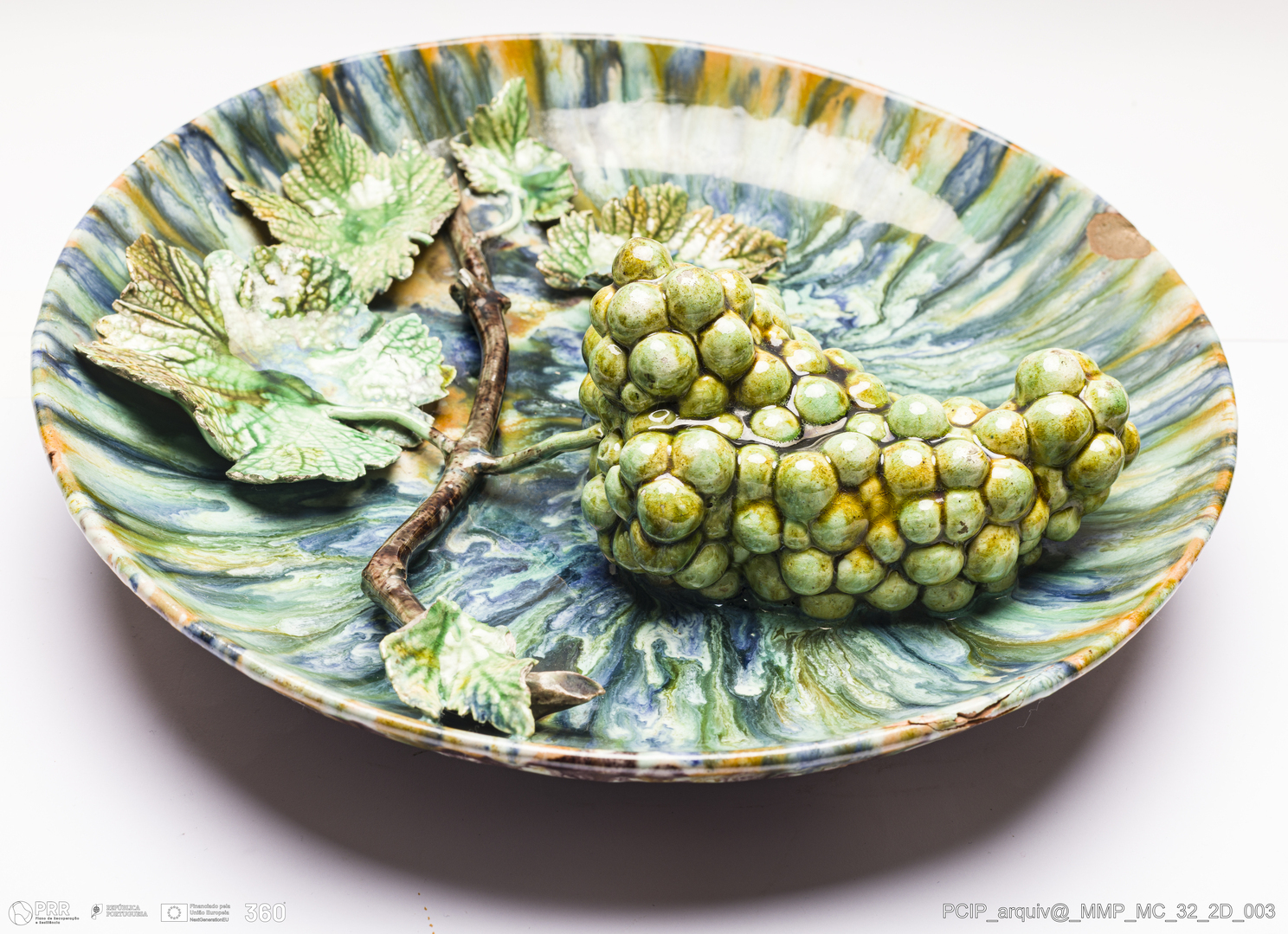 Matéria/Técnica: Barro vermelho moldado e modelado. Vidrado polícromo: castanho escuro e mel, verde, azul, cinzento e laranja; Cronologia: 1890; Autoria: Rafael Bordalo Pinheiro / Fábrica de Faianças das Caldas da Rainha, Portugal; Dimensões (cm): Altura: 9; Diâmetro: 26.
