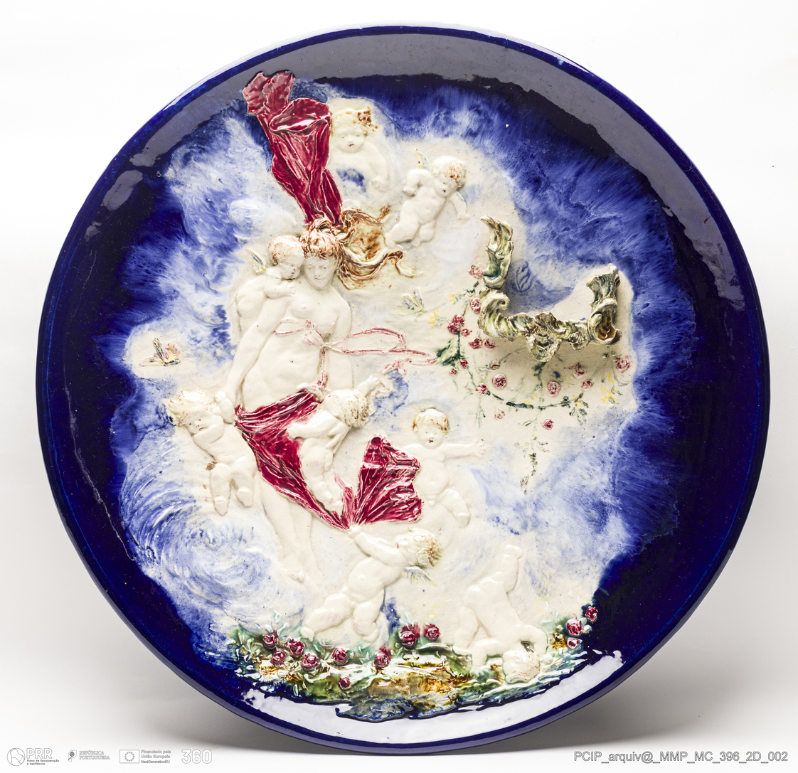 Matéria/Técnica: Barro moldado e modelado. Vidrado polícromo: azul escuro e claro, vermelho, verde e branco; Cronologia: 1892-1896; Autoria: Desconhecido / Atelier Cerâmico, Caldas da Rainha, Portugal; Dimensões (cm): Altura: 7,5; Diâmetro: 60.