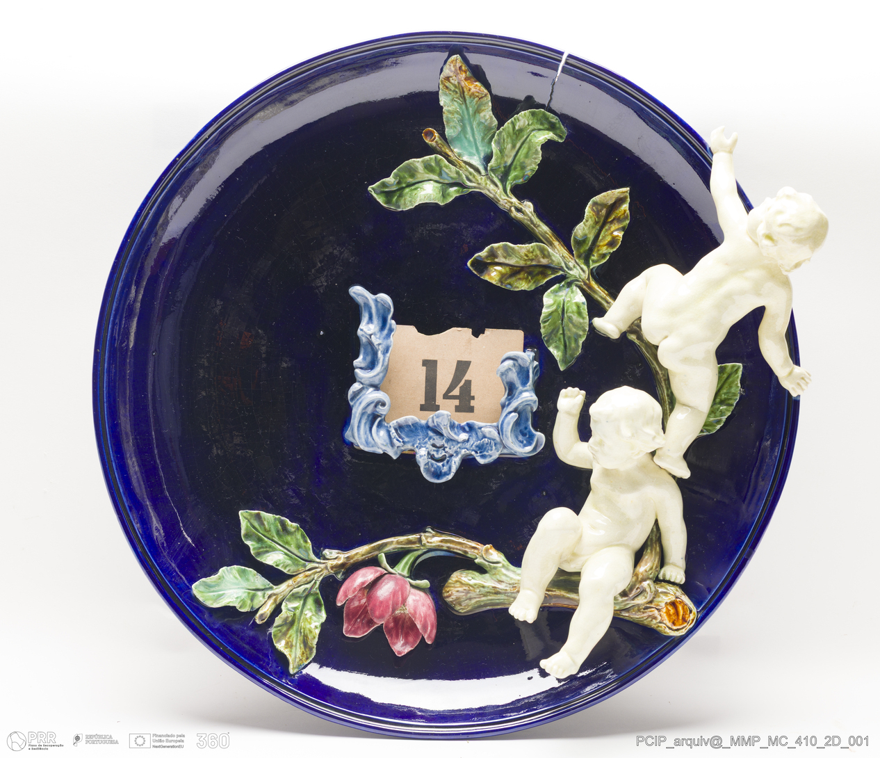 Matéria/Técnica: Barro branco moldado e modelado. Vidrado polícromo: azul, branco, rosa e verde; Cronologia: 1892-1896; Autoria: Josef Füller / Atelier Cerâmico, Caldas da Rainha, Portugal; Dimensões (cm): Altura: 9; Diâmetro: 40.