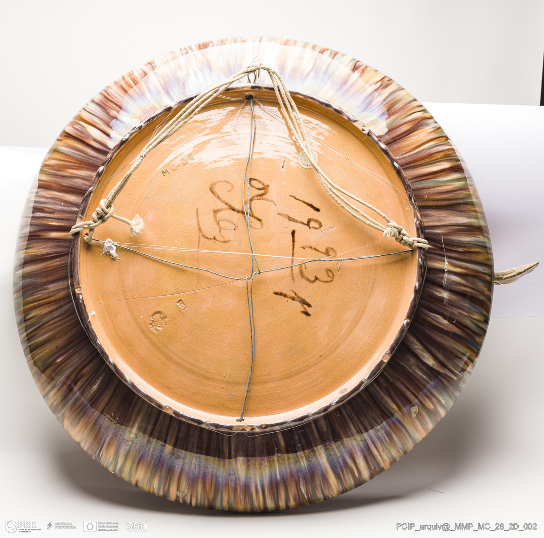 Matéria/Técnica: Barro vermelho rodado, moldado e modelado. Vidrado polícromo: preto, castanho escuro e mel, cinzento, azul, vermelho, verde, laranja, camurça e branco. Escorridos; Cronologia: 1892-1893; Autoria: Rafael Bordalo Pinheiro / Fábrica de Faianças das Caldas da Rainha, Portugal; Dimensões (cm): Altura: 25; Diâmetro: 60.