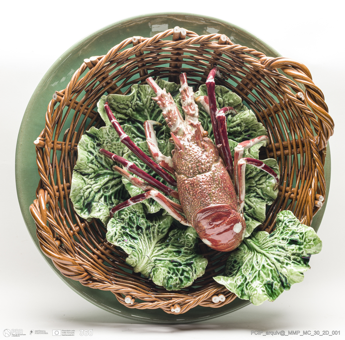 Matéria/Técnica: Barro branco moldado e modelado. Vidrado polícromo: castanho escuro e mel, verde, vermelho e camurça; Cronologia: 1900; Autoria: Rafael Bordalo Pinheiro / Fábrica de Faianças das Caldas da Rainha, Portugal; Dimensões (cm): Altura: 15; Diâmetro: 46.