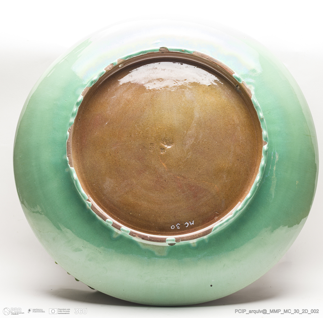 Matéria/Técnica: Barro branco moldado e modelado. Vidrado polícromo: castanho escuro e mel, verde, vermelho e camurça; Cronologia: 1900; Autoria: Rafael Bordalo Pinheiro / Fábrica de Faianças das Caldas da Rainha, Portugal; Dimensões (cm): Altura: 15; Diâmetro: 46.