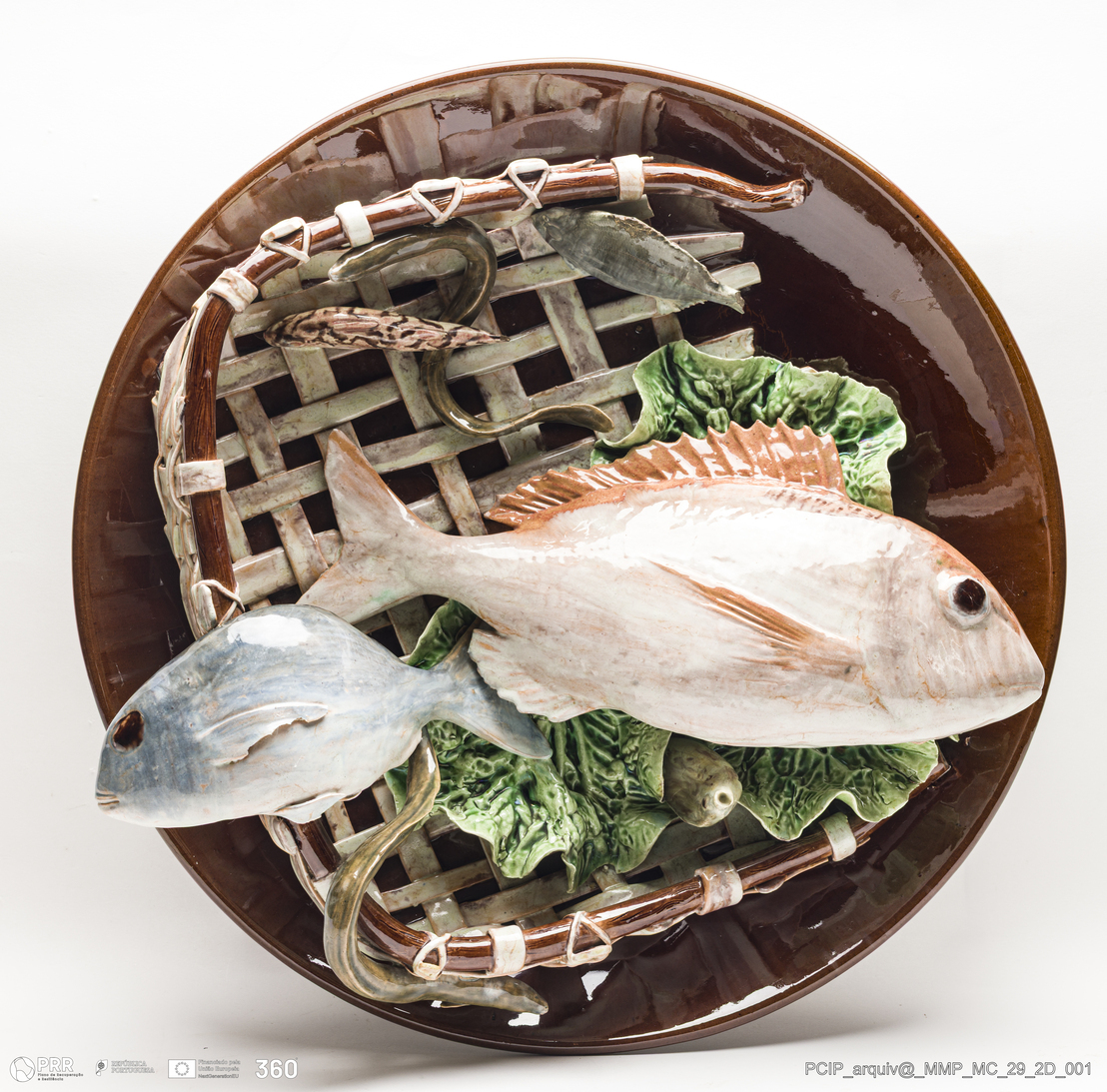 Matéria/Técnica: Barro vermelho moldado e modelado. Vidrado polícromo: castanho escuro, vermelho, salmão, camurça, cinzento e azul; Cronologia: 1898; Autoria: Rafael Bordalo Pinheiro / Fábrica de Faianças das Caldas da Rainha, Portugal; Dimensões (cm): Altura: 14; Diâmetro: 44,5.