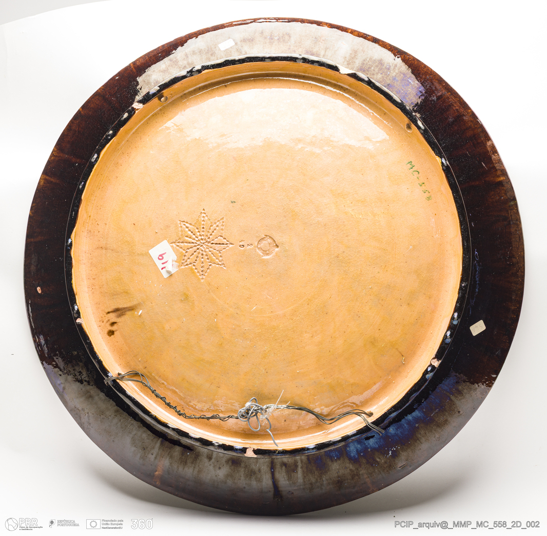 Matéria/Técnica: Barro moldado e modelado. Musgado.Vidrado polícromo verde e castanho; Cronologia: 1892-1896; Autoria: Desconhecido / Atelier Cerâmico, Caldas da Rainha, Portugal; Dimensões (cm): Altura: 5; Diâmetro: 60.