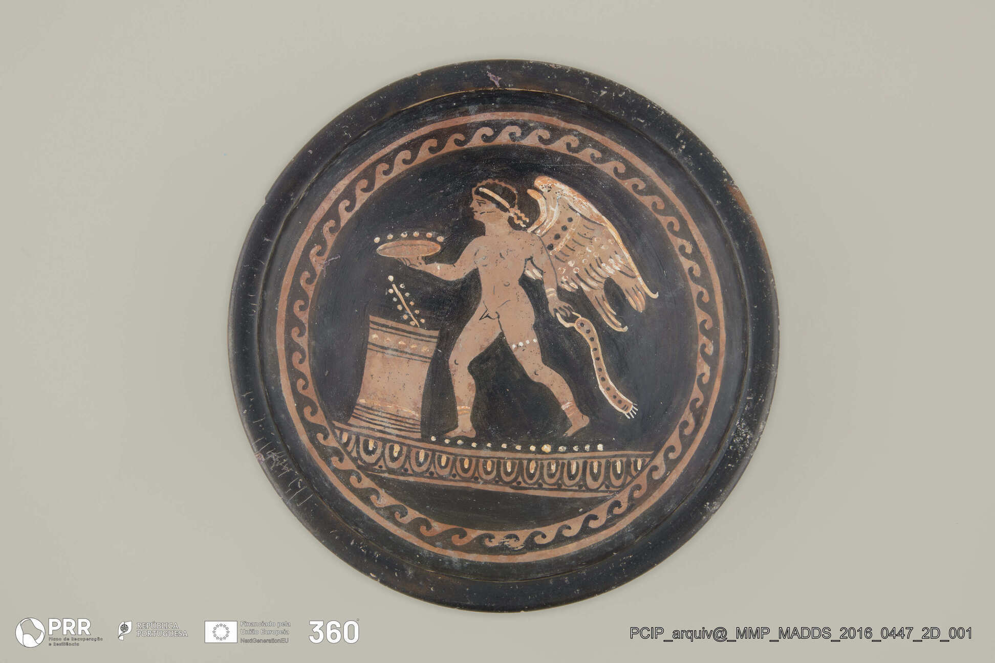 Matéria/Técnica: Cerâmica; Cronologia: Cerca 340 - 320 a.C; Autoria: Desconhecida; Dimensões (cm): 6 x 20 x 20.