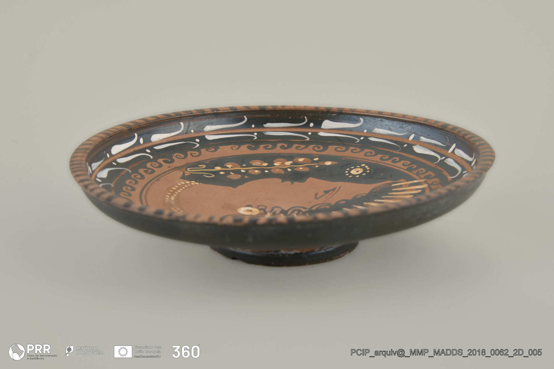 Matéria/Técnica: Cerâmica; Cronologia: Cerca de 340 a.C; Autoria: Desconhecida; Dimensões (cm): 4 x 16 x 16.