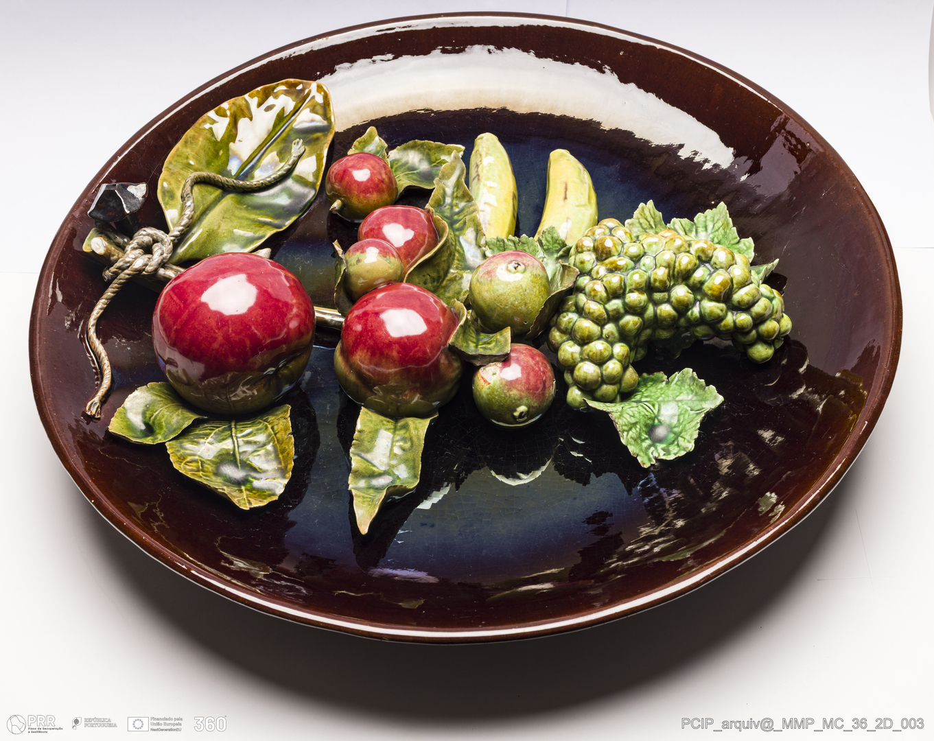 Matéria/Técnica: Barro vermelho rodado, moldado e modelado. Vidrado polícromo: preto, castanho escuro e mel, vermelho, verde e amarelo; Cronologia: 1905; Autoria: Rafael Bordalo Pinheiro / Fábrica de Faianças das Caldas da Rainha, Portugal; Dimensões (cm): Altura: 9; Diâmetro: 45.