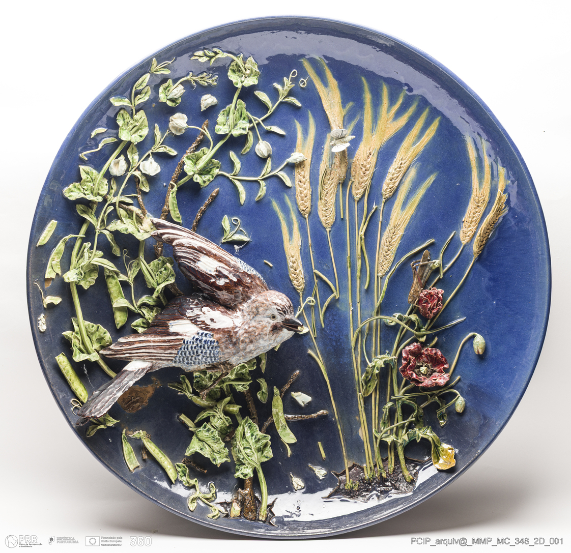Matéria/Técnica: Barro vermelho rodado, moldado e modelado. Vidrado polícromo: azul, verde, amarelo, castanho, branco e vermelho; Cronologia: 1905; Autoria: Rafael Bordalo Pinheiro / Fábrica de Faianças das Caldas da Rainha, Portugal; Dimensões (cm): Altura: 15; Diâmetro: 60.