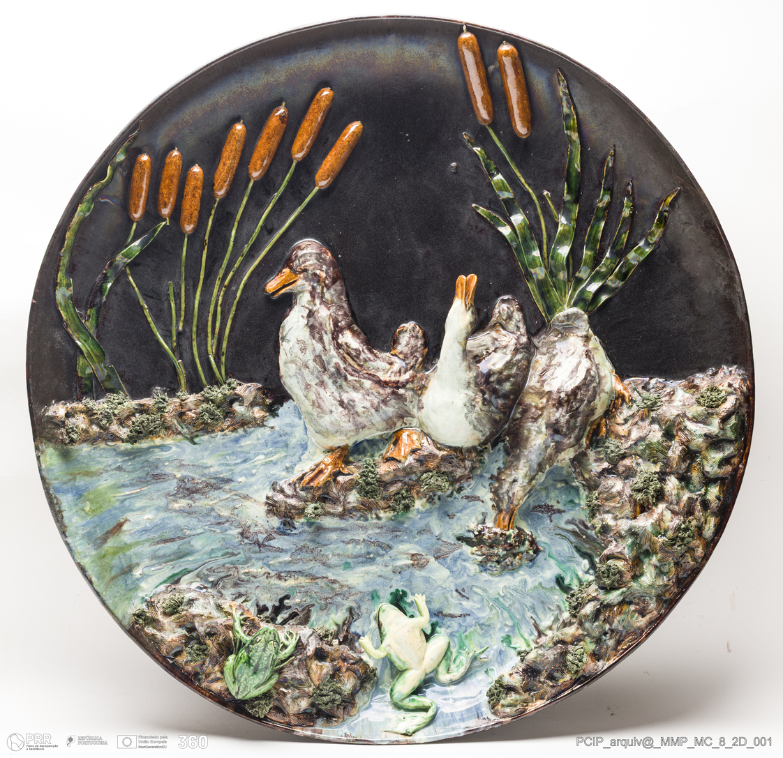 Matéria/Técnica: Barro vermelho moldado e modelado. Vidrado polícromo: preto, castanho, azul, verde, vermelho, laranja e branco; Cronologia: 1888; Autoria: Rafael Bordalo Pinheiro / Fábrica de Faianças das Caldas da Rainha, Portugal; Dimensões (cm): Altura: 86; Diâmetro: 60.