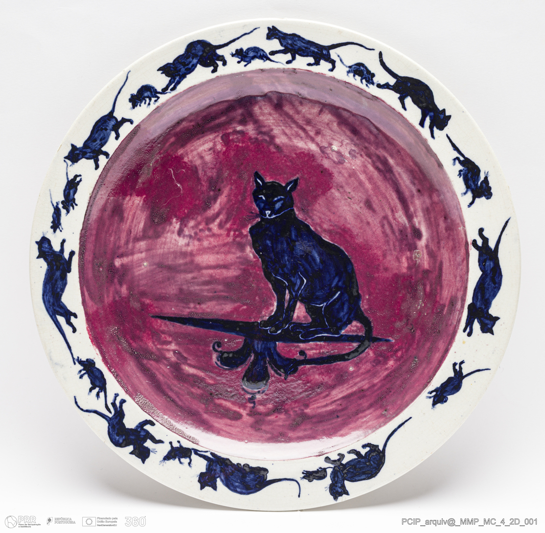 Matéria/Técnica: Pó de pedra moldada. Vidrado polícromo: preto, vermelho e branco; Cronologia: 1889; Autoria: Rafael Bordalo Pinheiro / Fábrica de Faianças das Caldas da Rainha, Portugal; Dimensões (cm): Altura: 2; Diâmetro: 25.