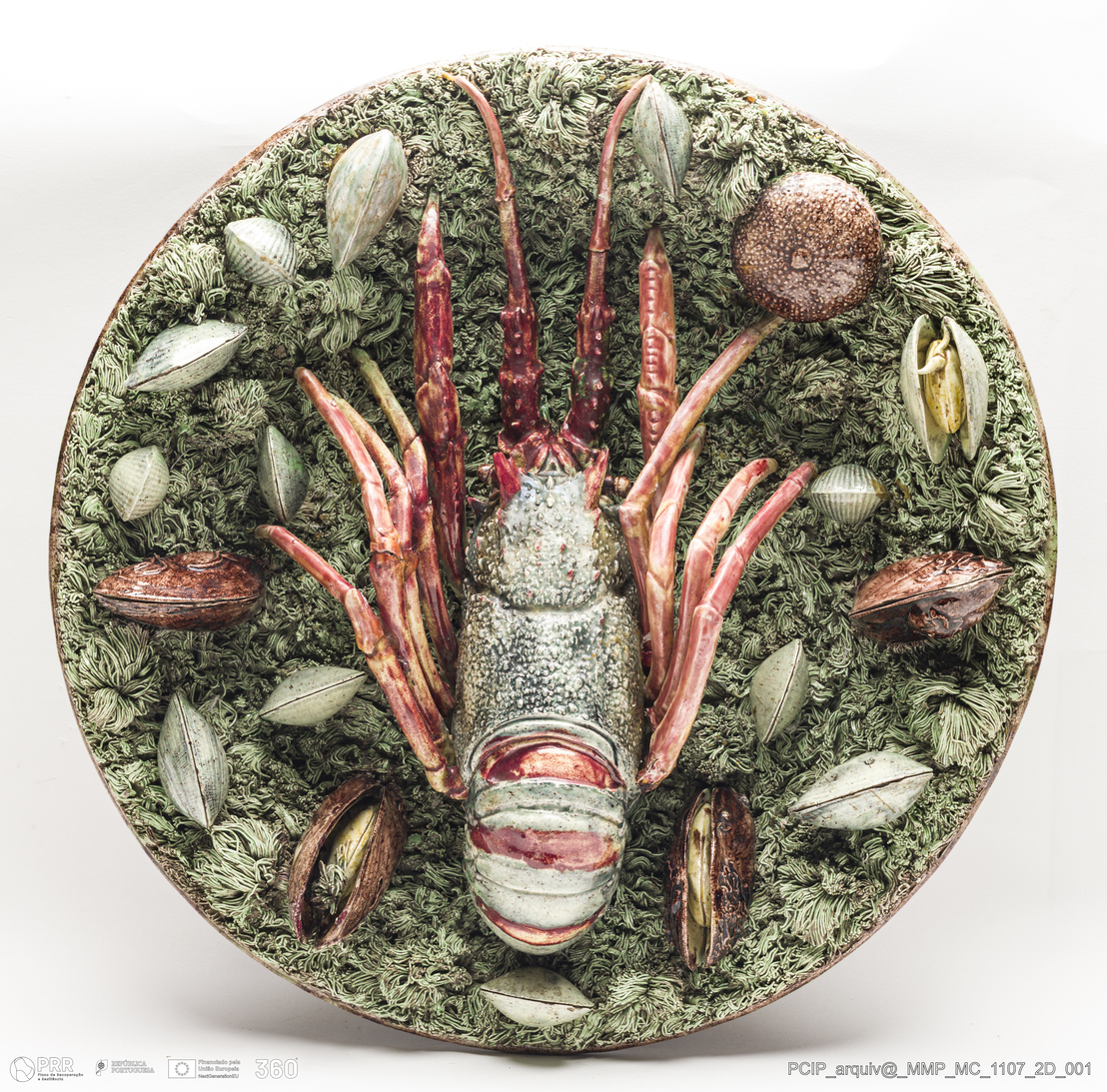 Matéria/Técnica: Barro vermelho rodado e moldado. Musgado. Vidrado polícromo: castanho, verde, vermelho e creme; Cronologia: 1888; Autoria: Manuel Cipriano Gomes Mafra / Fábrica De Manuel Cipriano Gomes Mafra, Caldas da Rainha, Portugal; Dimensões (cm): Altura: 12; Diâmetro: 41,2.