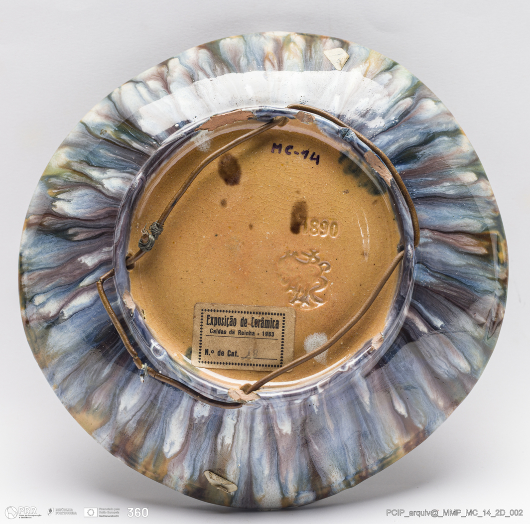 Matéria/Técnica: Barro branco rodado, modelado e moldado. Vidrado polícromo: preto, verde, azul, castanho, camurça e branco; musgados e escorridos em tons de azuis e castanhos; Cronologia: 1890; Autoria: Rafael Bordalo Pinheiro / Fábrica de Faianças das Caldas da Rainha, Portugal; Dimensões (cm): Altura: 5; Diâmetro: 19,5.
