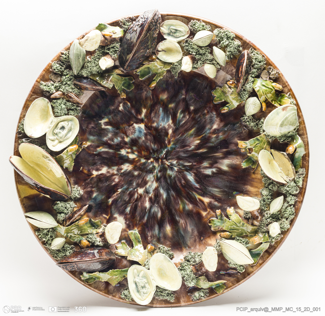 Matéria/Técnica: Barro branco rodado e modelado. Vidrado polícromo: preto, castanho escuro e mel, cinzento, azul, verde, vermelho e camurça. Escorridos e musgados; Cronologia: 1896; Autoria: Rafael Bordalo Pinheiro / Fábrica de Faianças das Caldas da Rainha, Portugal; Dimensões (cm): Altura: 9; Diâmetro: 42.