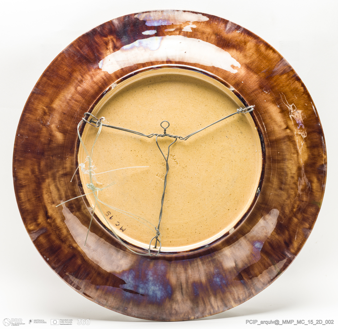 Matéria/Técnica: Barro branco rodado e modelado. Vidrado polícromo: preto, castanho escuro e mel, cinzento, azul, verde, vermelho e camurça. Escorridos e musgados; Cronologia: 1896; Autoria: Rafael Bordalo Pinheiro / Fábrica de Faianças das Caldas da Rainha, Portugal; Dimensões (cm): Altura: 9; Diâmetro: 42.