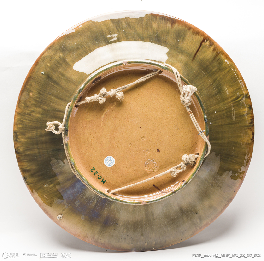 Matéria/Técnica: Barro branco moldado e modelado. Vidrado polícromo;: preto, castanho, cinzento, azul, verde, vermelho e camurça. Musgados e escorridos; Cronologia: 1898; Autoria: Rafael Bordalo Pinheiro / Fábrica de Faianças das Caldas da Rainha, Portugal; Dimensões (cm): Altura: 10; Diâmetro: 43.