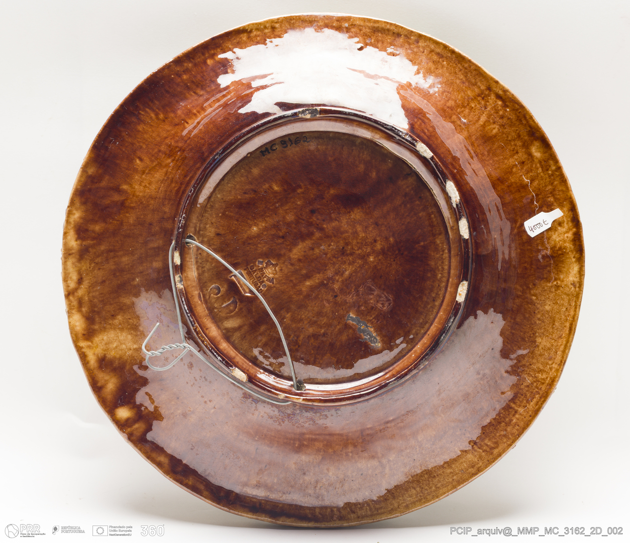 Matéria/Técnica: Barro branco moldado e modelado. Musgados. Vidrado polícromo: castanho escuro e mel, azul, verde, amarelo e camurça; Cronologia: 1870-1887; Autoria: Manuel Cipriano Gomes Mafra / Fábrica De Manuel Cipriano Gomes Mafra, Caldas da Rainha, Portugal; Dimensões (cm): Altura: 9,5; Diâmetro: 31,5.